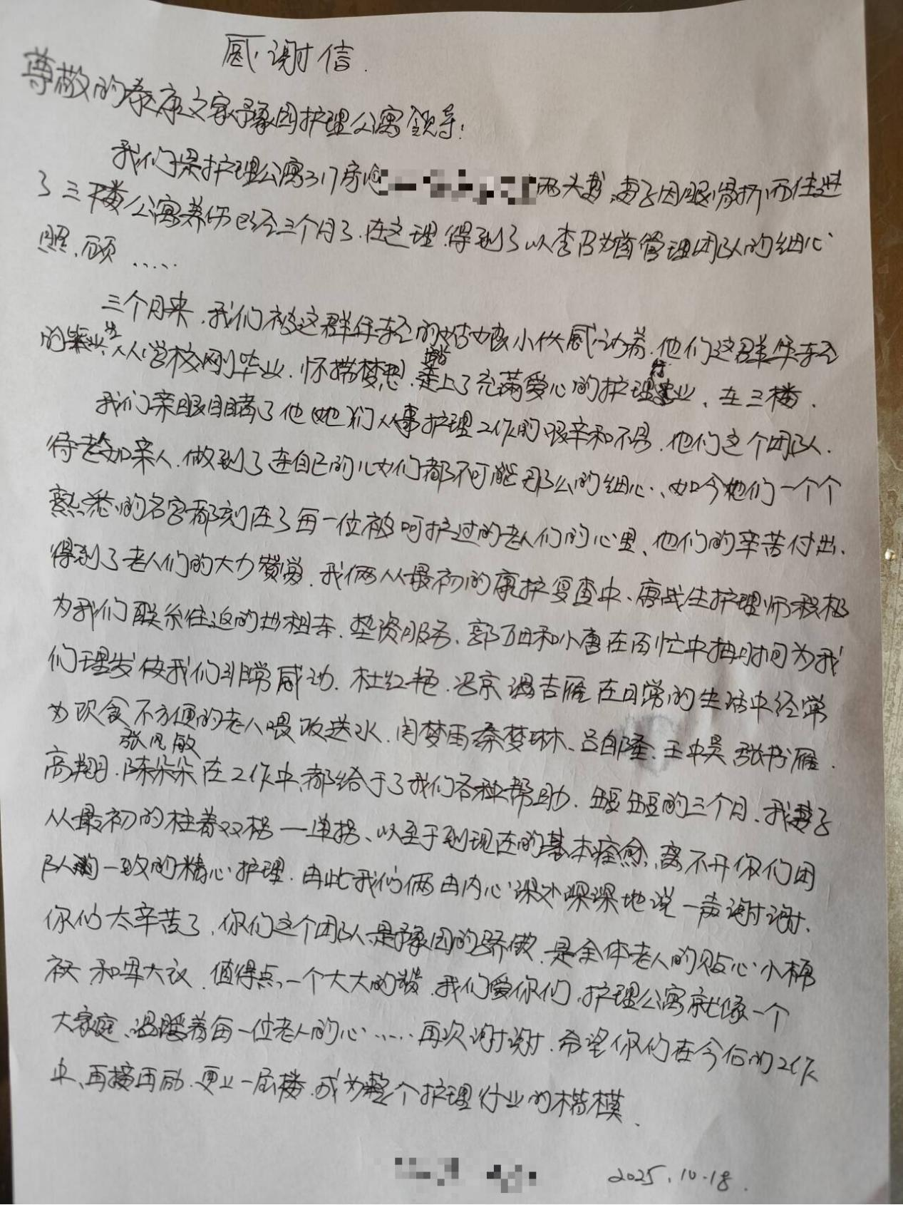 实习期间,同学们全心投入,将在校积淀的理论知识娴熟运用于照护实践。他们以严谨规范的操作保障长者安全,更以无微不至的体贴慰藉长者心灵。晨间协助起居的细心梳理,午后陪伴活动的欢声笑语,夜间巡视查房的轻柔脚步,处处体现着专业素养与人性温度的交融。正是这份超越职责要求的真诚付出,让长者们感受到了亲人般的温暖,才有了锦旗上“敬老助人扬美德”的由衷赞许,以及感谢信中“耐心细致,胜似家人”的真挚评价。