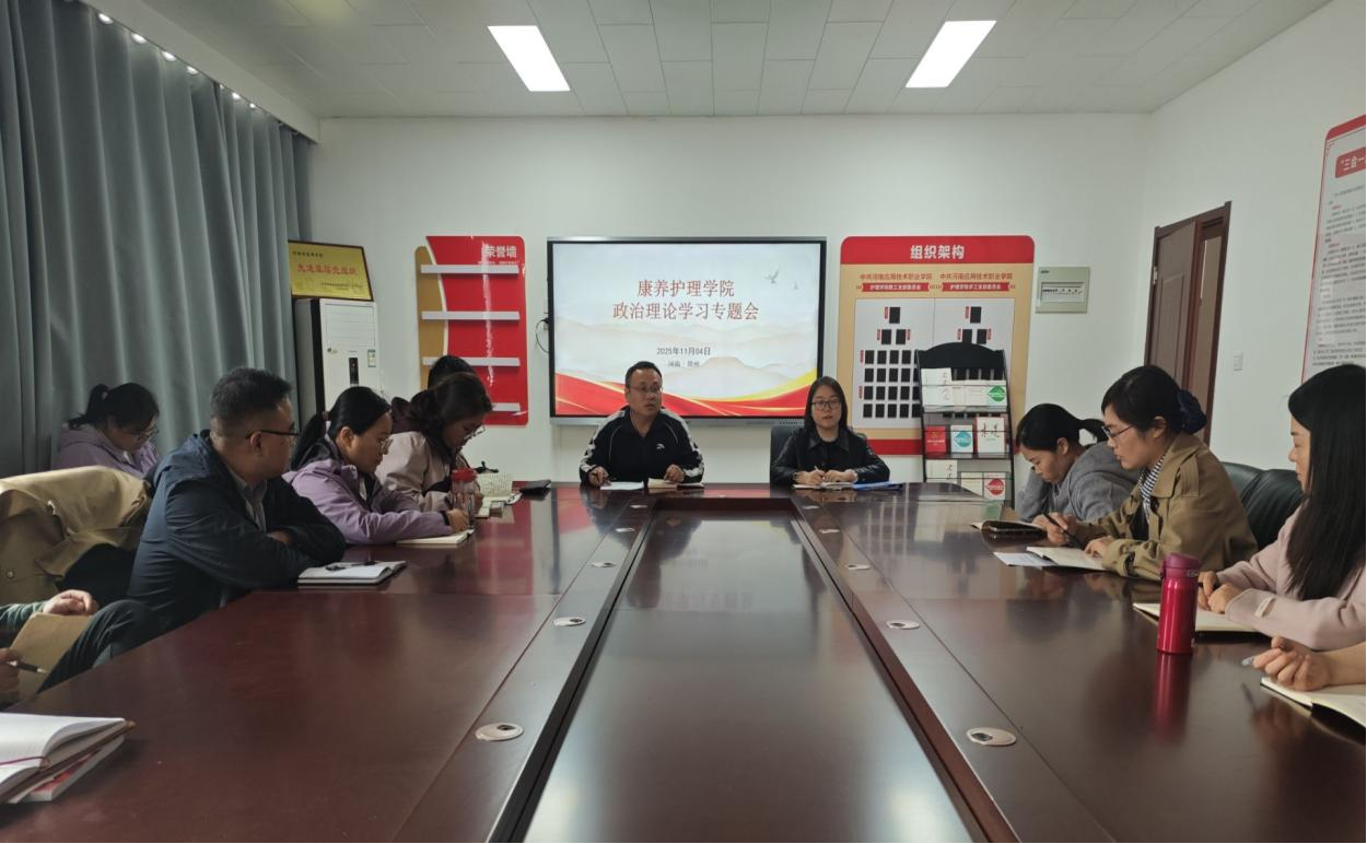 11月4日下午,康养9428cn太阳集团全体教职工在办公楼515会议室开展了政治理论学习活动。此次学习活动由学院党总支书记张忠勇主持。活动围绕“学习中央最新部署、把握‘十五五’战略方向、强化纪律教育”三大核心议题展开,旨在统一思想、凝聚共识,推动学院高质量发展与国家战略需求深度融合。